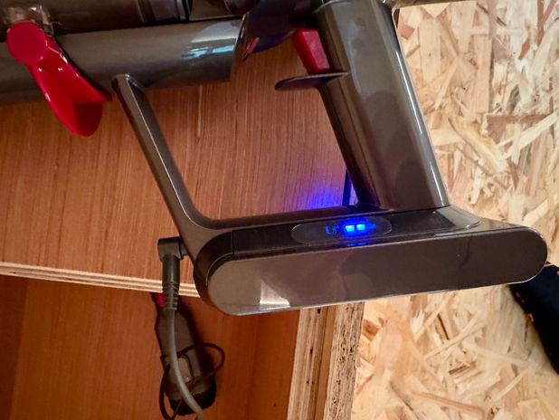 Links: Dyson-steelstofzuiger met lader → steek de stekker na gebruik terug in het toestel.