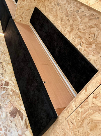 Open de deksels via de vingergaten; klap volledig open.→ Sluiten = deksels dicht, kussen terug, tafel terug.