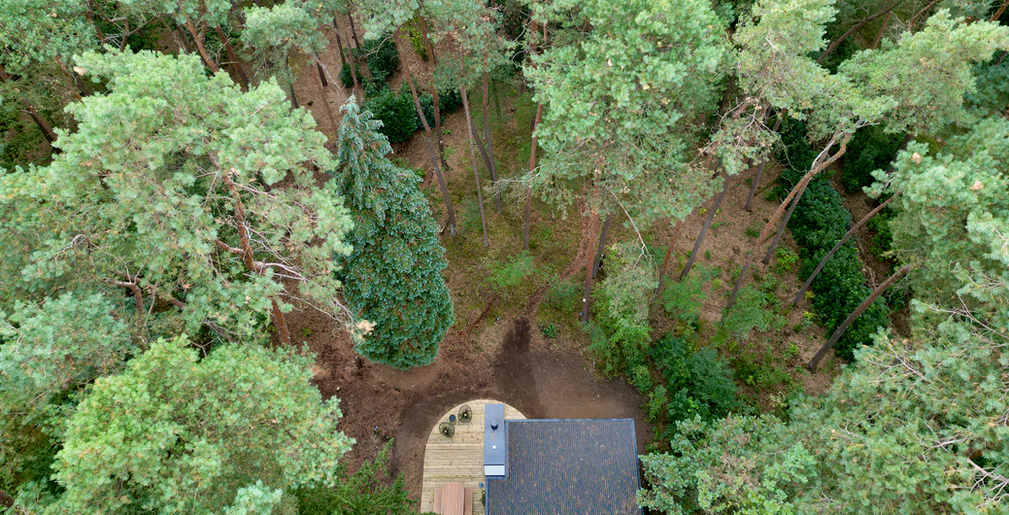 Begin 2022 kochten we het aangrenzende bos naast Zwarte Zwaan – mét een verlaten chalet uit de jaren ’60. Een duidelijke bestemming zagen we nog niet, maar we gingen meteen aan de slag met het bos. Het eerste jaar haalden we tonnen afval en oude tuinplanten weg, plantten nieuwe bomen en vervingen de roestige prikkeldraad door een diervriendelijke afsluiting. Takkenwallen boden meteen een thuis voor dieren én een oplossing voor de vele rododendrontakken. Niet zonder succes: al snel lieten vele eekhoorns en zelfs reeën zich zien.